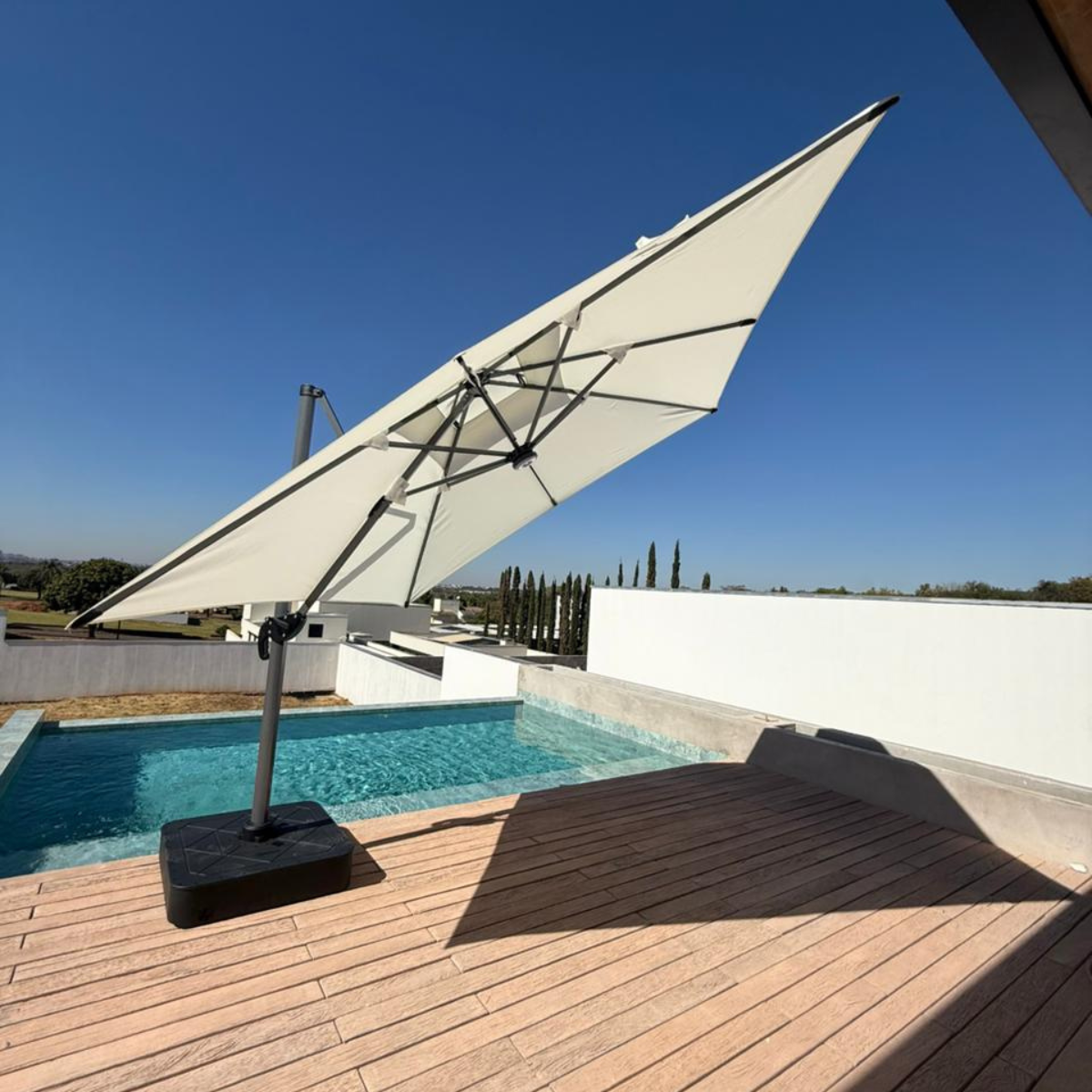 Com estrutura em alumínio anodizado, cobertura de 3x3 metros, base de 150 litros com rodinhas e sistema de giro 360°, o Monte Carlo foi feito para quem não abre mão de conforto, estética e durabilidade, mesmo sob sol forte, vento ou umidade.